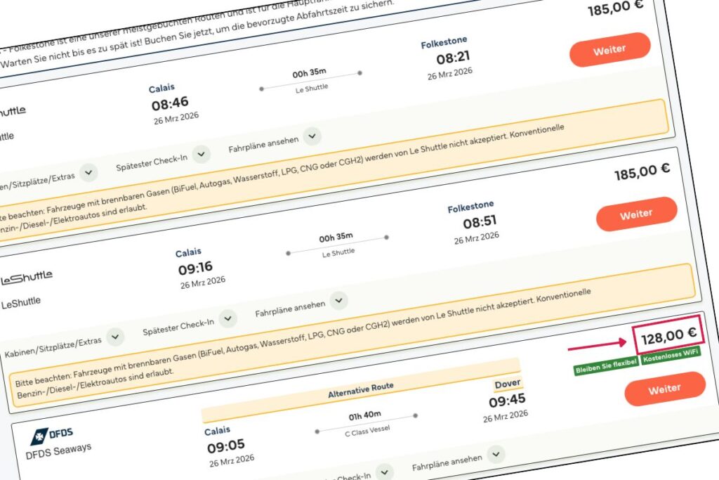 Der Vorteil dieser Buchungsübersicht: Sie sehen nicht nur die aktuellen Eurotunnel Preise, sondern können diese direkt mit den günstigsten Fährverbindungen vergleichen, so finden Sie in wenigen Sekunden die beste Option für Ihre Reise.